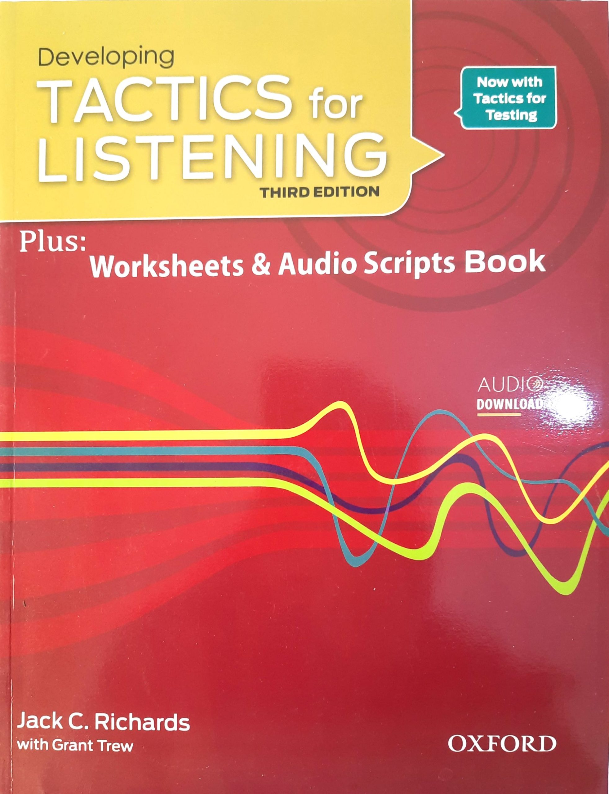 یکی از بهترین منابع موجود برای تقویت مهارت شنیداری کتاب TACTICS FOR LISTENING است. این کتاب نوشته جک ریچارد و از محصولات انتشارات اکسفورد و دارای سه سطح با این عناوین است: Basic، Developing، Expanding. تألیف و تنظیم این کتاب به گونه ای است که تمامی مکالمات روزمره و پرکاربرد انگلیسی را در بر می گیرد؛ مواردی مانند: توصیف افراد، تقویم و تاریخ، معرفی و احوالپرسی، ورزش، اماکن، سرگرمی، رستوران، قیمت ها، مکالمات کوتاه، زندگی آپارتمانی، برنامه ها و آرزوها، خرید، توصیف اشیا، تعطیلات، مردم و سلامتی.